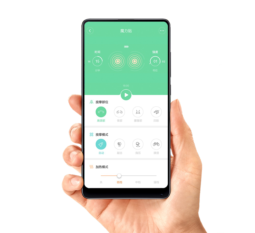 间歇式供温,温感更适宜人体,开启按摩功能后,若贴片未正常接触皮肤时,或贴片脱离主机时,主机则会连续嘀5声,自动关闭,确保用户使用安全。